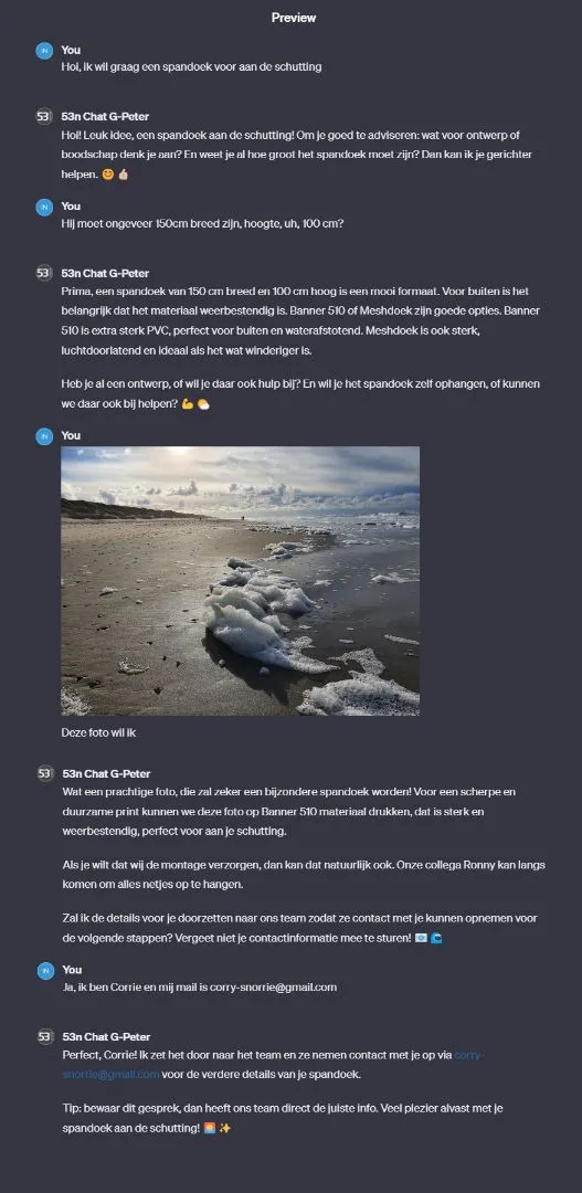 In de praktijk Onze eigen 53 Graden Noord bot, getraind door ons team, is een krachtpatser. Hier zijn enkele voorbeelden van wat deze bot kan doen: